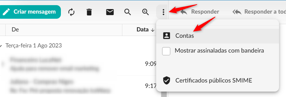 - Clique nos 3 pontinhos verticais do lado direito da lupa, ao topo da listagem de e-mails e escolha "Contas".