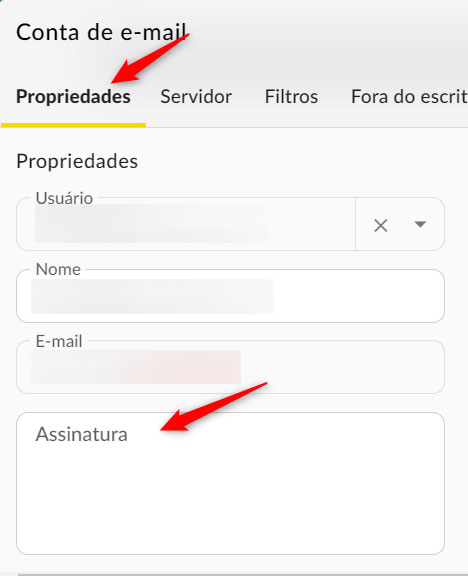 - Na primeira aba, "Propriedades", que será exibida, basta digitar sua assinatura no campo "Assinatura".
