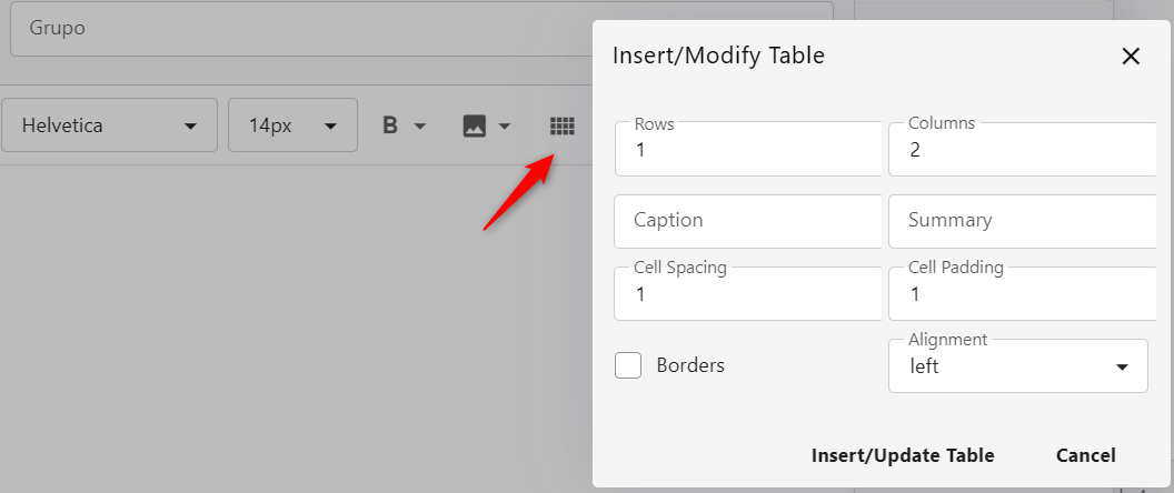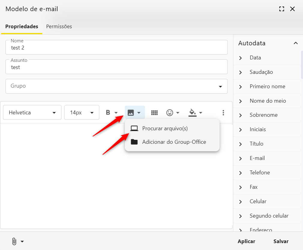 - Para adicionar seu logotipo, clique nas 2 setinhas ao final da barra dos ícones de edição e escolha "Inserir imagem no texto > Adicionar do Group-Office".