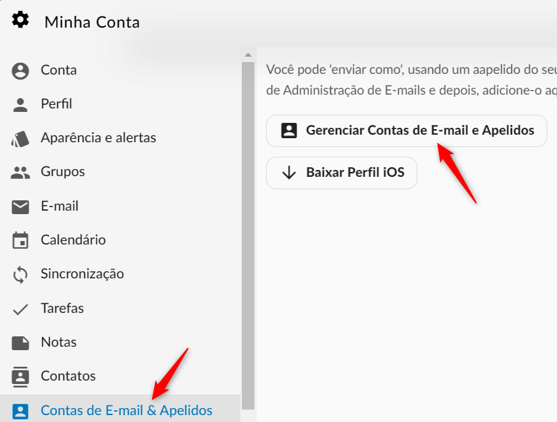 - Agora, vá até a opção "Contas de E-mail & Apelidos" / "Gerenciar Contas de E-mail e Apelidos".