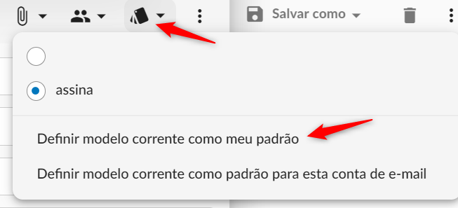 - Clique mais uma vez no ícone Modelo de e-mails e agora escolha "Definir modelo corrente como meu padrão", para que essa assinatura apareça por padrão ao criar uma nova mensagem. Caso não faça isso, terá que escolhê-la manualmente, pelo ícone de "Modelo de e-mails", ao compor uma nova mensagem.